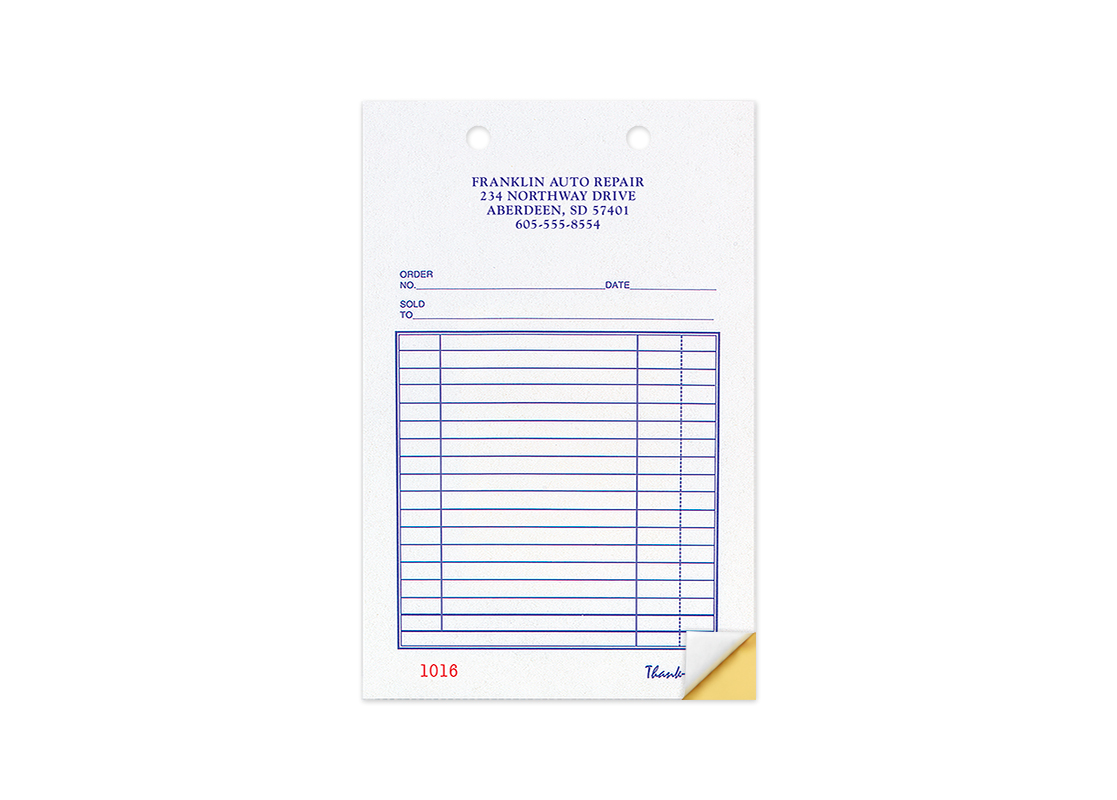 Custom business forms are a great way to get a professional and promotional edge over your competitors. Add your company's logo or stock artwork to this sales form to ensure you stand out. Specialized forms offer versatility and provide the correct fields that match your company and services. • Custom, pre-formatted sales forms, 5-3/8" x 8-1/2"• 3-Part carbonless forms, white/canary/pink• Box of 250 forms• Printed with black ink and customized with up to 4 lines of text • Add optional stock images or your company's custom logo at no additional charge• Consecutive numbering available up to 6 digits